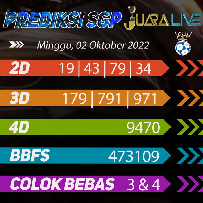 Prediksi SGP Jitu Hari Ini Minggu 2 Oktober 2022 – Selamat datang untuk semua sobat togelers di situs Prediksi SGP Jitu yang merupakan tempat khusus memberikan prediksi-prediksi yang tepat dan akurat untuk membantu para sobat togelers.