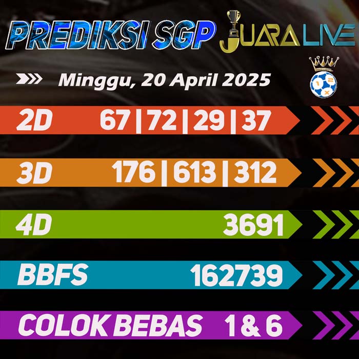 Prediksi SGP Jitu Hari Ini Minggu 20 April 2025 – Selamat datang untuk semua sobat togelers di situs Prediksi SGP Jitu yang merupakan tempat khusus memberikan prediksi-prediksi yang tepat dan akurat untuk membantu para sobat togelers.