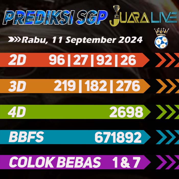 Prediksi SGP Jitu Hari Ini Rabu 11 September 2024 – Selamat datang untuk semua sobat togelers di situs Prediksi SGP Jitu yang merupakan tempat khusus memberikan prediksi-prediksi yang tepat dan akurat untuk membantu para sobat togelers.