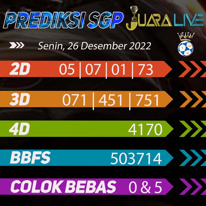 Prediksi SGP Jitu Hari Ini Senin 26 Desember 2022 – Selamat datang untuk semua sobat togelers di situs Prediksi SGP Jitu yang merupakan tempat khusus memberikan prediksi-prediksi yang tepat dan akurat untuk membantu para sobat togelers.
